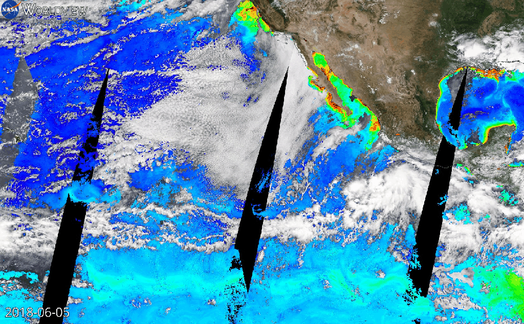 Above: animation of hurricanes and satellite-sensed chlorophyll concentrations in the eastern Pacific in summer 2018. Hurricane Bud is the large storm in mid June (dates in bottom left corner). Warmer colors indicate more chlorophyll; note the big red/yellow spot left by Bud! (Black regions are gaps in the satellite coverage.)