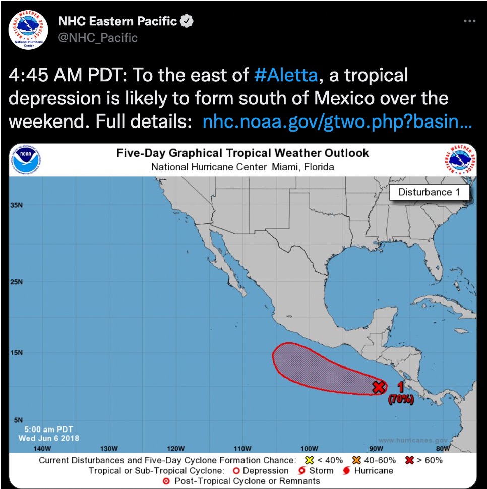 We had a research expedition to the eastern tropical Pacific (the area off Mexico and Central America) planned for June 9-25, 2018, with the aim of capturing seasonal variations in this important area of the ocean. Obviously we hoped to dodge the start of hurricane season, but conditions were ripe for hurricane development—including hot sea surface temperatures of 32 degrees C, or nearly 90 degrees F. Thanks to science and technology, we knew early and accurately that a hurricane would develop—as well as when, where, and how things might change. So we had a plan (and a backup plan, and a backup to that) that was put in motion after a tweet from the National Hurricane Center (NHC) flapped its wings: